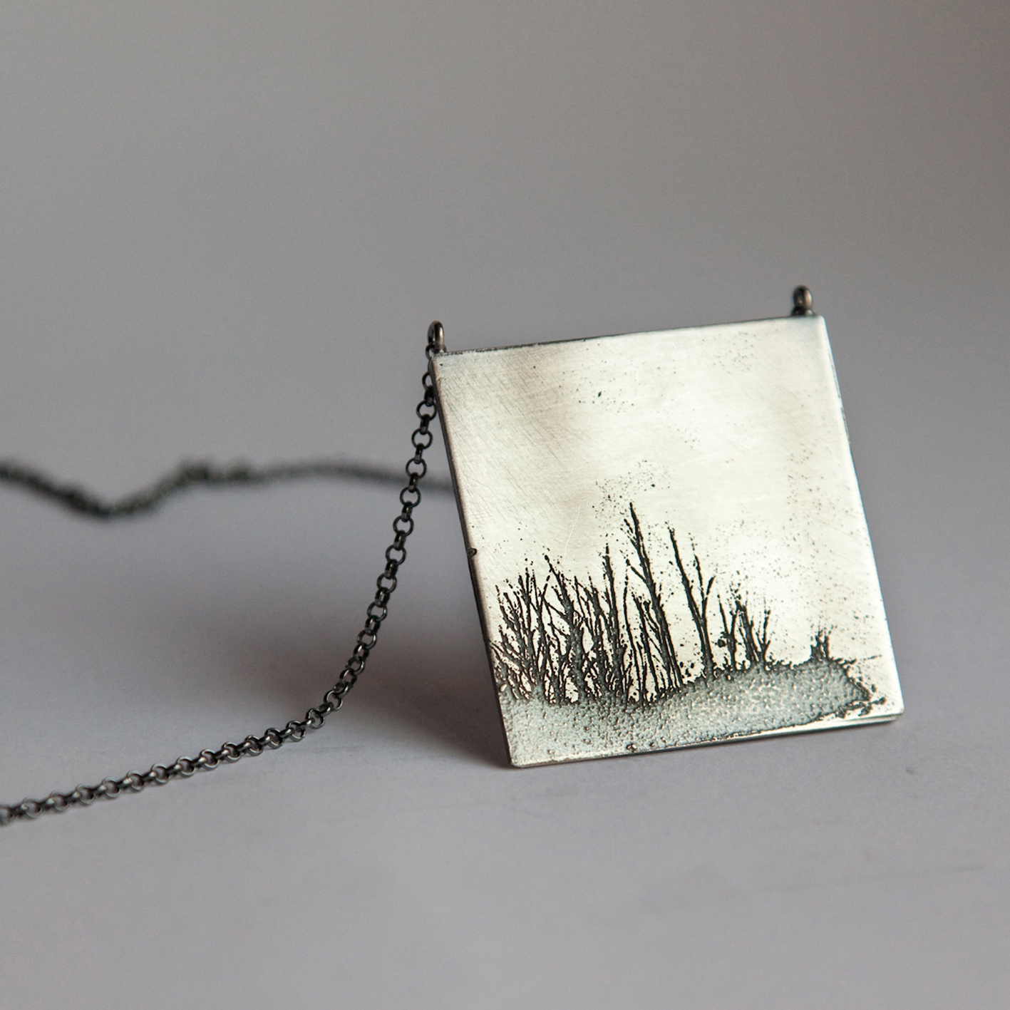 Collar largo de plata con imagen grabada a través de la técnica del fotograbado.
