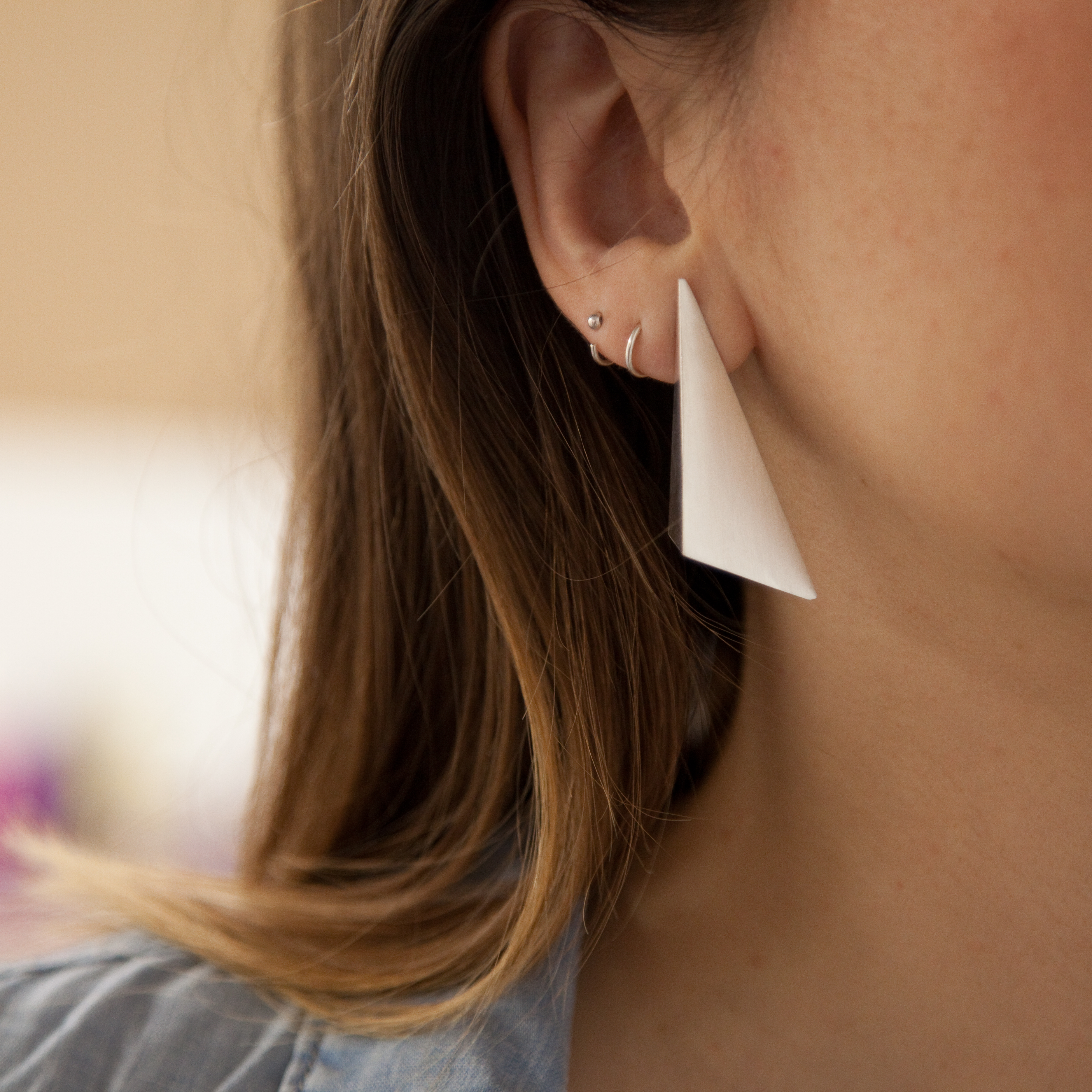 Los pendientes de la colección MÉTRIC son unos pendientes de diseño, de estilo geométrico y minimalista. Como toda la colección busca la belleza en las formas simples, generando volumen mediante la técnica del plegado en metal, con pliegues limpios y lisos. Sin duda una pieza que destaca tanto por su sencillez y contundéncia..