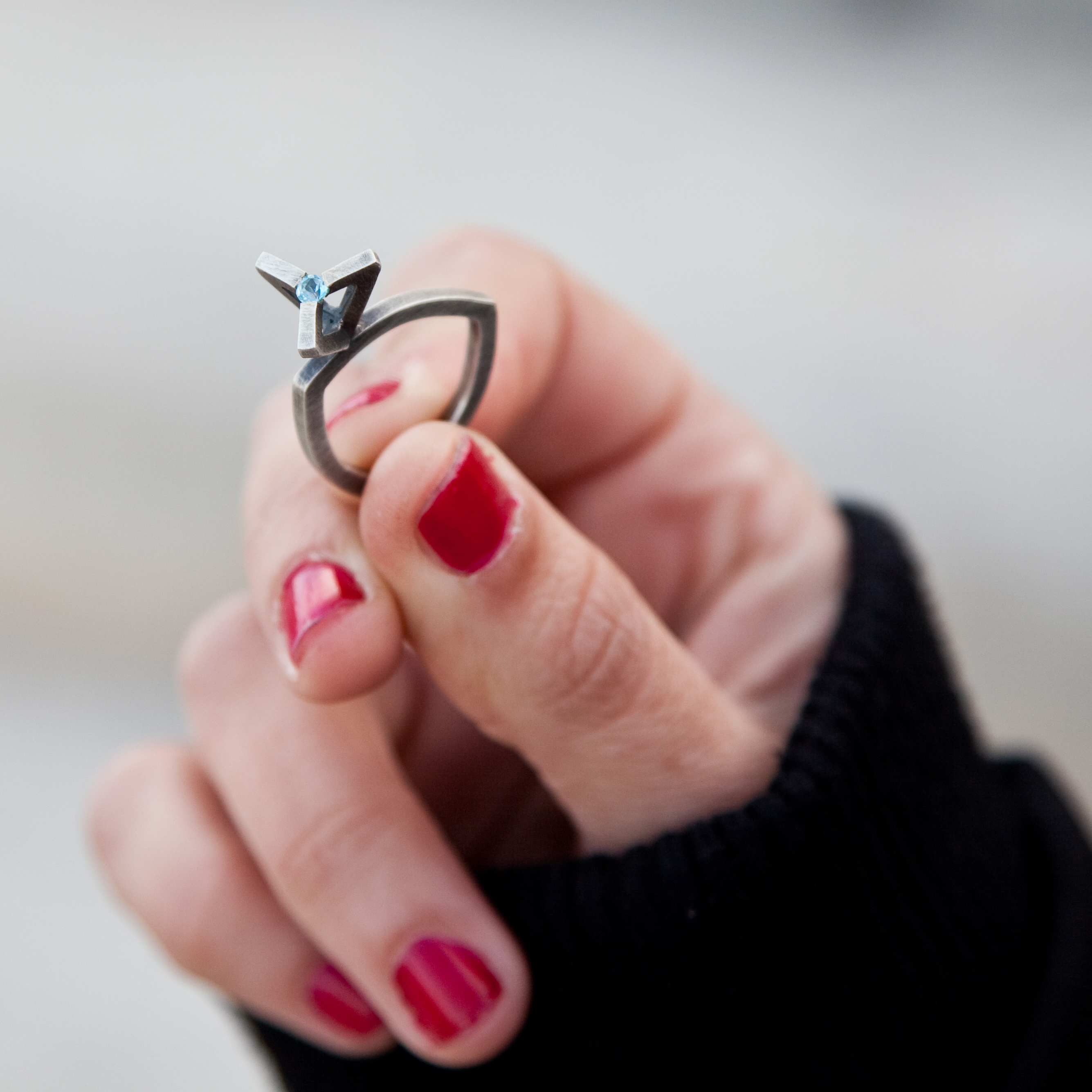 Anell de plata oxidada amb topàs natural de 3 mm. El braç de l’anell té una forma triangular arrodonida, molt ergonòmic. El fil de plata del braç és de secció quadrada i sustenta una espectacular montura.